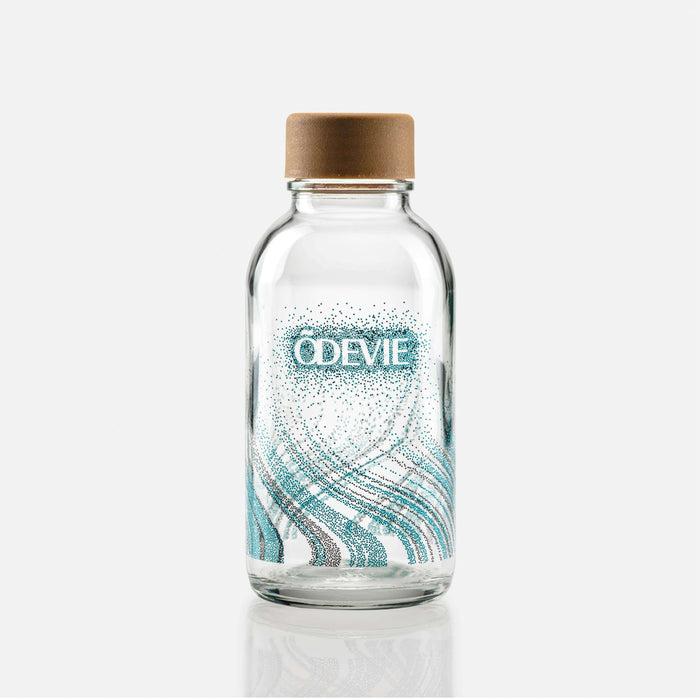 Bouteille verre déco 400 ml, entièrement en matériau recyclé et recyclable, made in Germany, pour emporter l’hypertonique ou l’isotonique en vacances, au bureau.